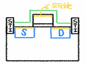 Silicide(실리사이드)는 Metal과 Si(실리콘) 사이 쇼트키 접촉을 방지하기 위한 것입니다.