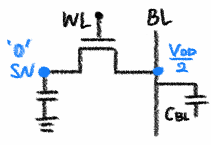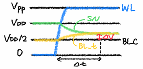 SA (Sense Amplifier)에서 BL 전압의 변화를 감지하여 '0'을 판별하게 됩니다.