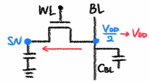 이에 따라 SN의 전압은 감소하고, BL의 전압은 증가하게 됩니다.