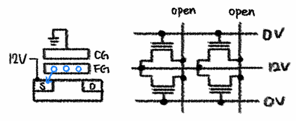 드레인에 Strong Positive Voltage를 인가하면 Channel Hot Electron Injection이 발생하여 Program를 하게 됩니다.