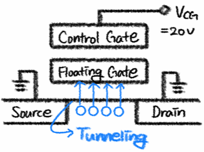 : 높은 드레인 전압에 의해 소스에서 드레인으로 이동하는 전자가 공핍 영역에서 강한 전계로 인해 높은 운동 에너지를 가지게 되면서 일부가 산화막 전위 장벽을 뚫고 들어가 Floating Gate에 Trap
