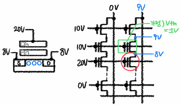 다른 셀에서는 Tunneling이 발생하지 않도록 Vpgm(20V)보다 낮은 전압을 WL에 인가해줍니다.