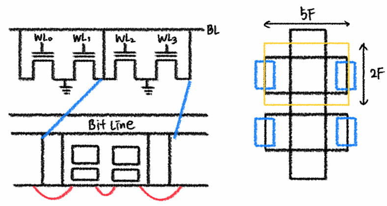 먼저 해당 BL에 연결된 트렌지스터들은 높은 전압을 견딜 수 있어야 하고, 따라서 옥사이드 두께가 두꺼워야 하기 때문에 칩 사이즈가 커지게 됩니다.